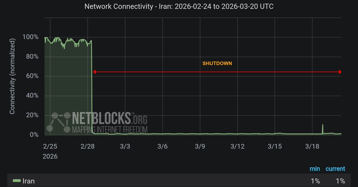 אתר נט-בלוקס, שמנטר הפרעות אינטרנט ברחבי העולם, דיווח בבוקר שישי (29 אספנד) שאיראן לקראת חג הנורוז עדיין נמצאת ב'חשיכה דיגיטלית'. ניתוק האינטרנט נמשך כבר יותר מ-480 שעות ונכנס ליום ה-21.