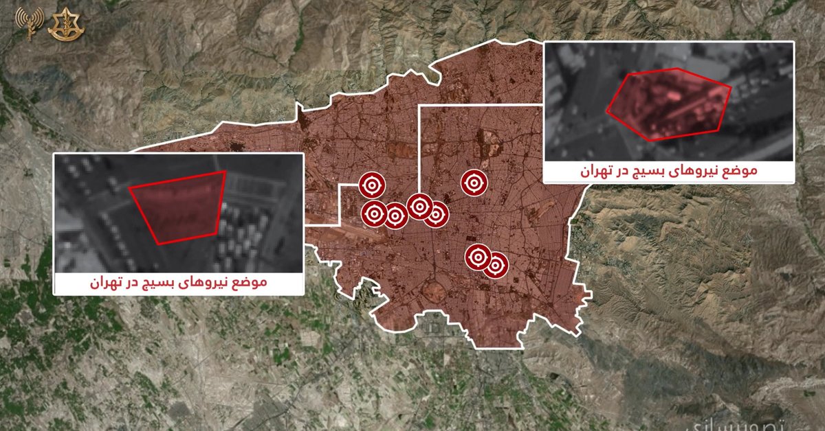 ישראל הודיעה שהחיל האוויר תקף בשעות האחרונות עמדות של כוחות הבסיג' בלמעלה מ‑10 נקודות בטהרן. לפי הצבא גם הותקפה עמדת חירום של הבסיג' והמשמרות המהפכניים שהייתה בעבר מגרש כדורגל. צבא...