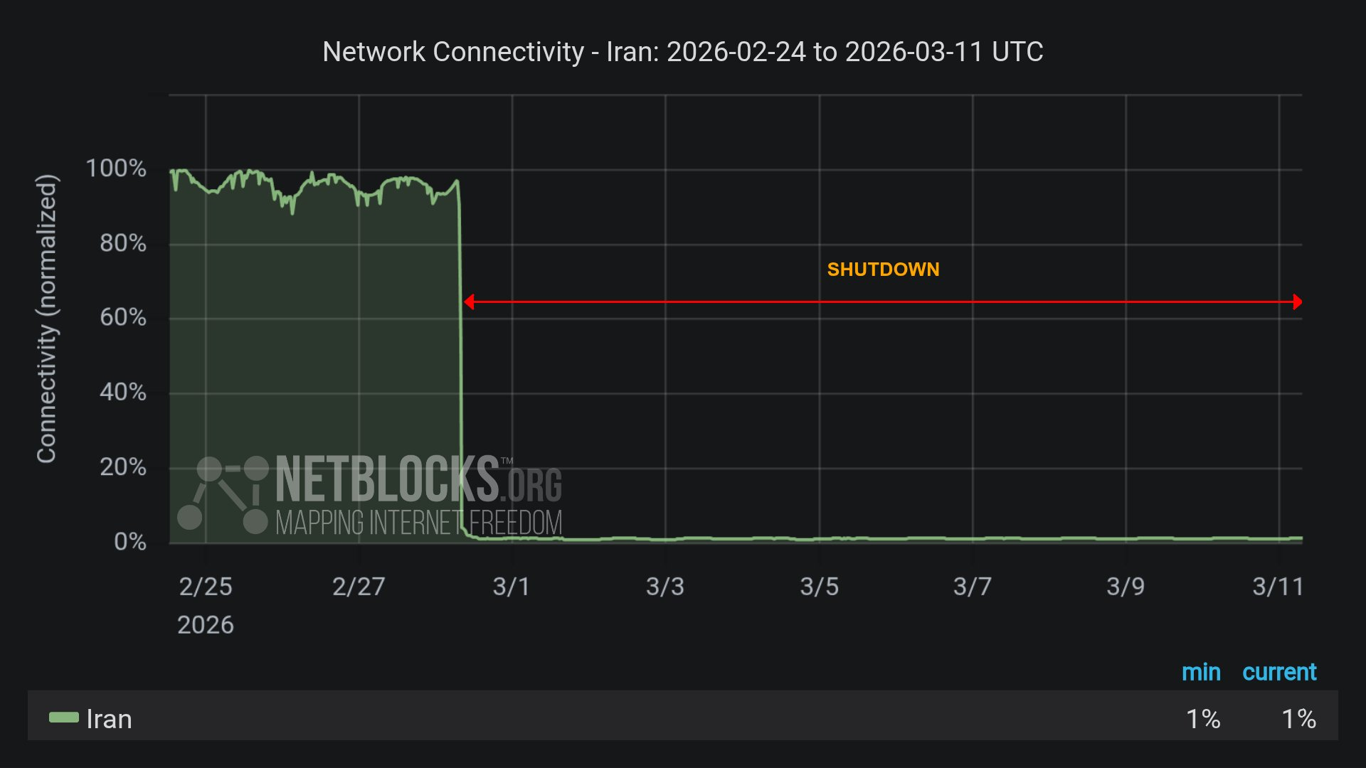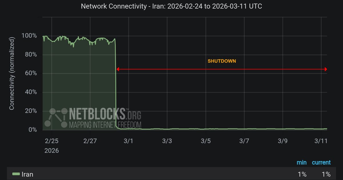 ארגון NetBlocks הודיע שהשבתת האינטרנט הנרחבת באיראן נמשכת וכבר נכנסה ליום ה־12 (לאחר 264 שעות). רמת החיבור נשארת כ־1% מהרמה הרגילה. לפי הדו"ח, ההפרעה הארצית נמשכת וגישת המשתמשים לרשת העולמית...
