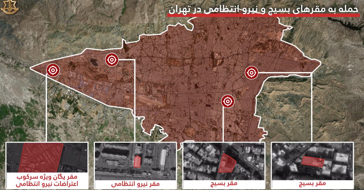 צבא ישראל הודיע כי הוא תקף עשרות מתקנים של כוחות המשטר והבסיג' באיראן. הוא אמר שהמשטר האיראני השתמש במתקנים האלה כדי לשמור על שליטה בכל רחבי איראן.