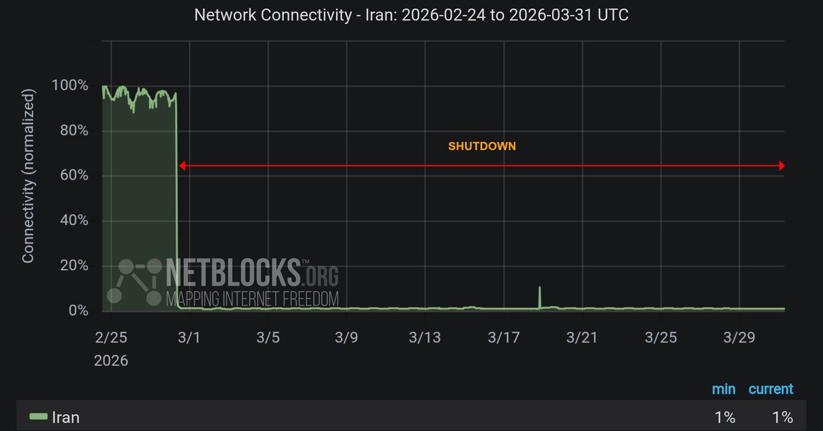 אתר NetBlocks, המשגיח על שיבושי אינטרנט בעולם, דיווח הבוקר (שלישי) שניתוק האינטרנט באיראן נכנס ליום ה‑32 ומשתמשים כבר למעלה מ‑744 שעות מנותקים מהאינטרנט הבינלאומי.